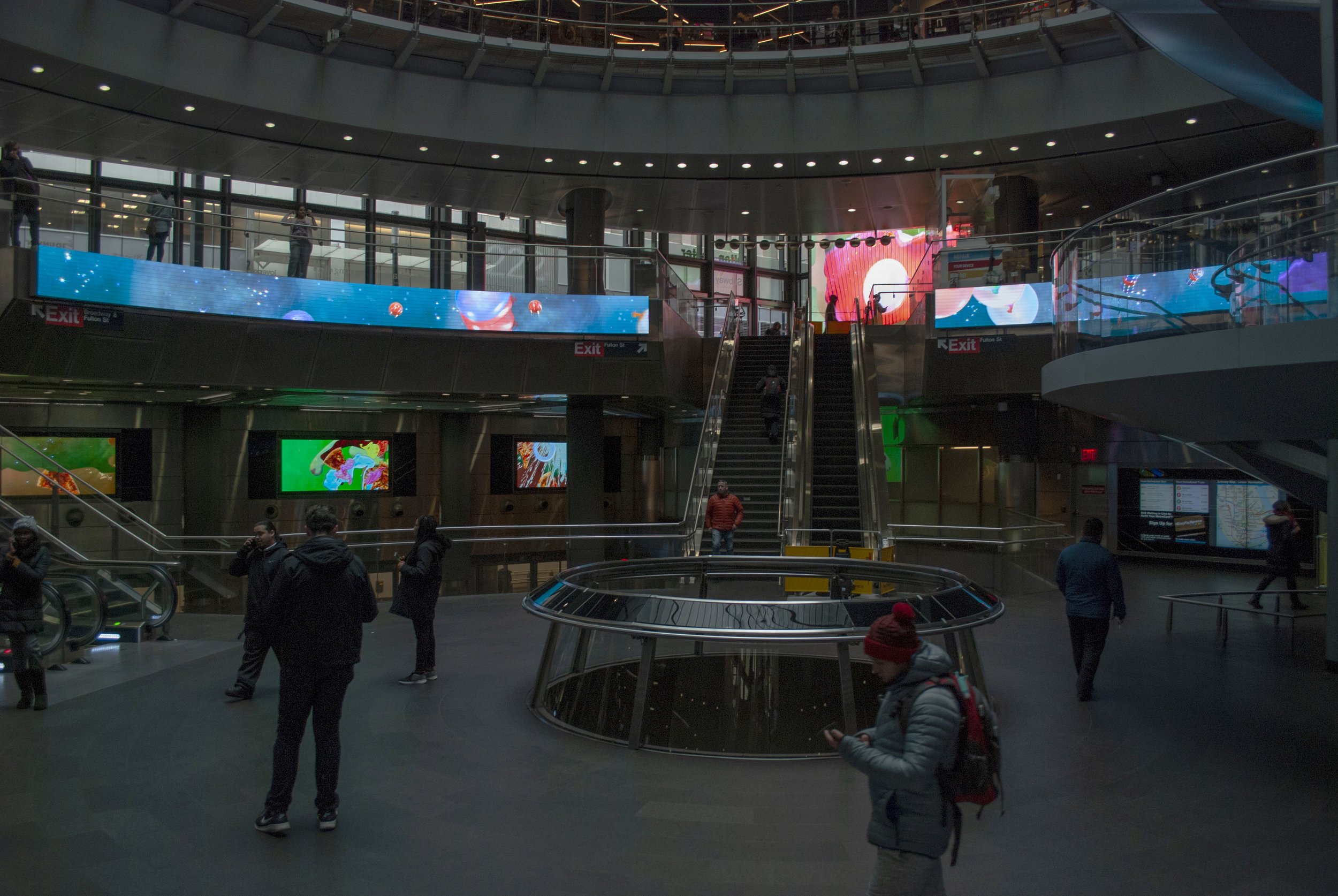 Artist Dave Greber’s Skyyys™is the most recent iteration of his vibrant, digital abstractions created from recognizable, colorful kinetic objects, such as balloons, bouncing balls, and stuffed animals. Skyyys™playfully mimics the persistent activity and change that defines our material world and transit experiences. The piecereferences and remixes the distinct, but convergent, forces between virtual media streams and our infinitely inventive minds, which simultaneously inhabit the same time and space. The tidal pace, whimsical imagery, and prismatic palette of Skyyys™creates harmonious visual-music that complements the pace of commuters at Fulton center, a likewise kaleidoscopic, liminal space, in the heart of visually diverse New York City.